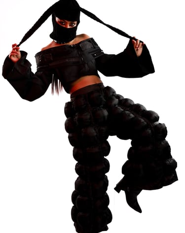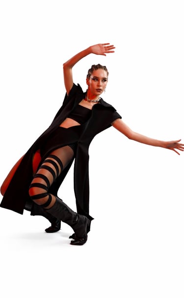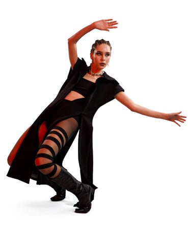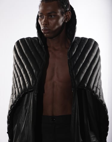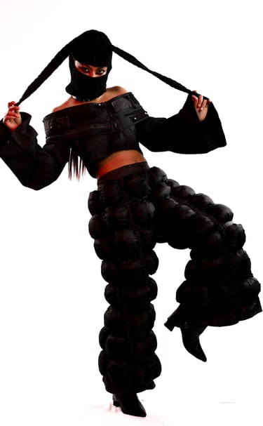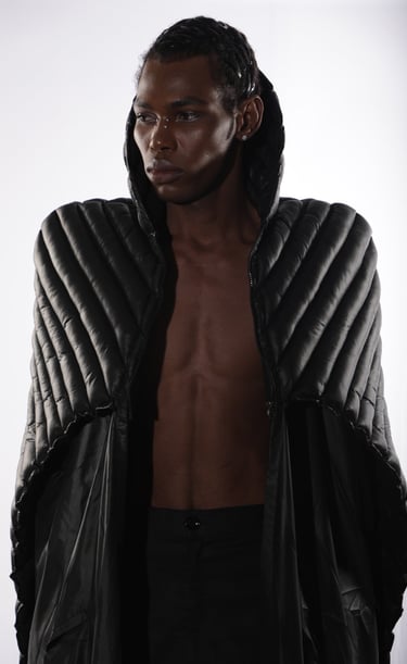 Avant-garde silhouettes draped in deep crimson and shadow.